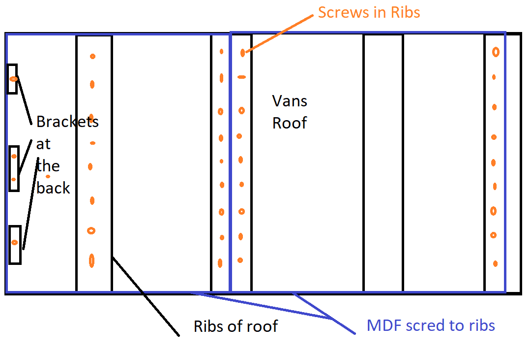 To install the MDF in the roof I screwed into the roof braces that come with the van. These braces are ribs that run along the width of the van. By screwing into the braces directly, I didn’t need to screw into the roof (which I do not recommend at all as that will put holes in your roof and cause a leak!)