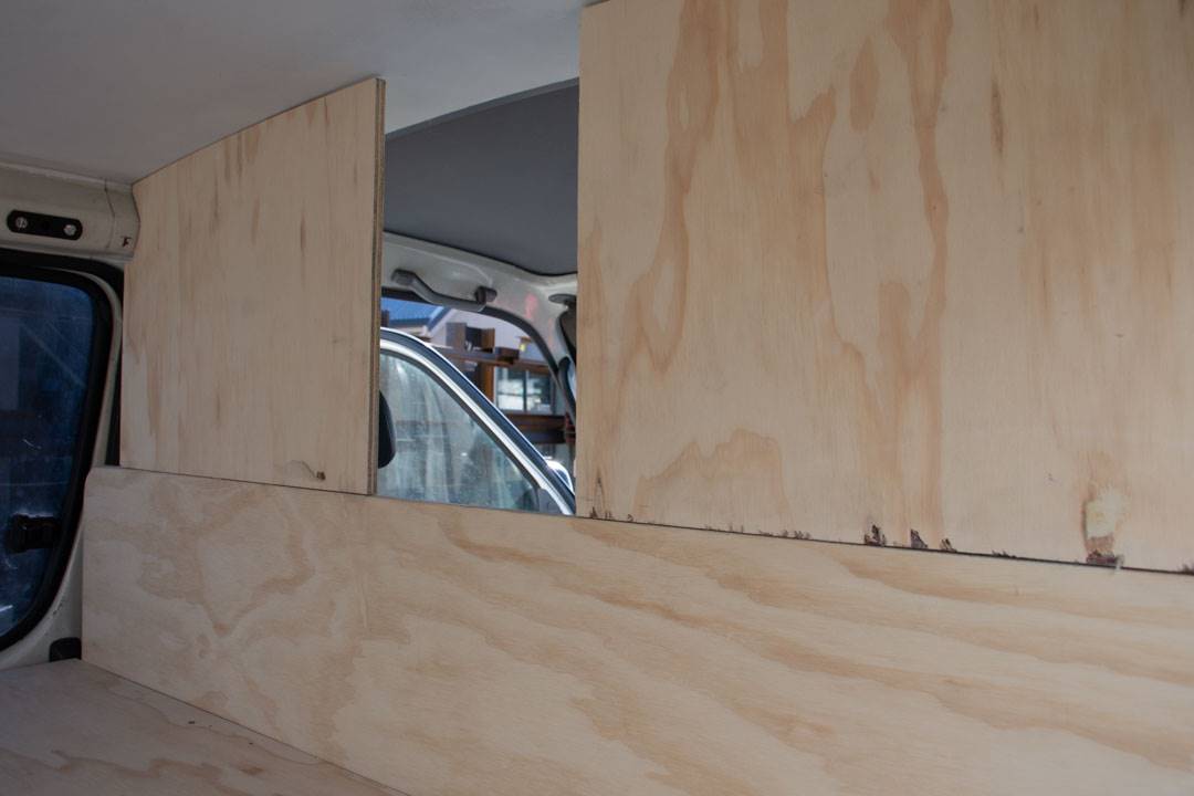 The first step was to work out how to cut my pieces of wood. I figured out that for the back section of the van (where there were no doors) I would need to do each side in two pieces. This was because the curve of the walls was too much to bend the ply.