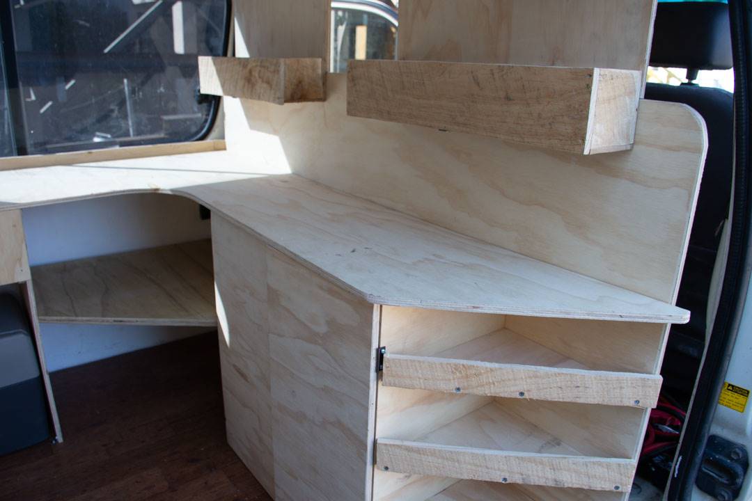 We decided to put our kitchen in the front, behind the seats and bed in the back. This design meant we could cook inside the campervan when it rained here in New Zealand (which it does a lot!). It also meant we had amazing views when you were at campsites as you could lay in your bed and look out the back of the van.