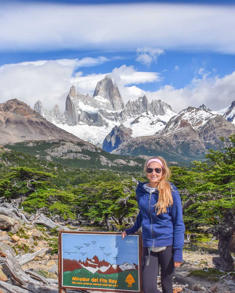 Bailey stands looking at Mirador Las Torres in Torres del Paine National Park