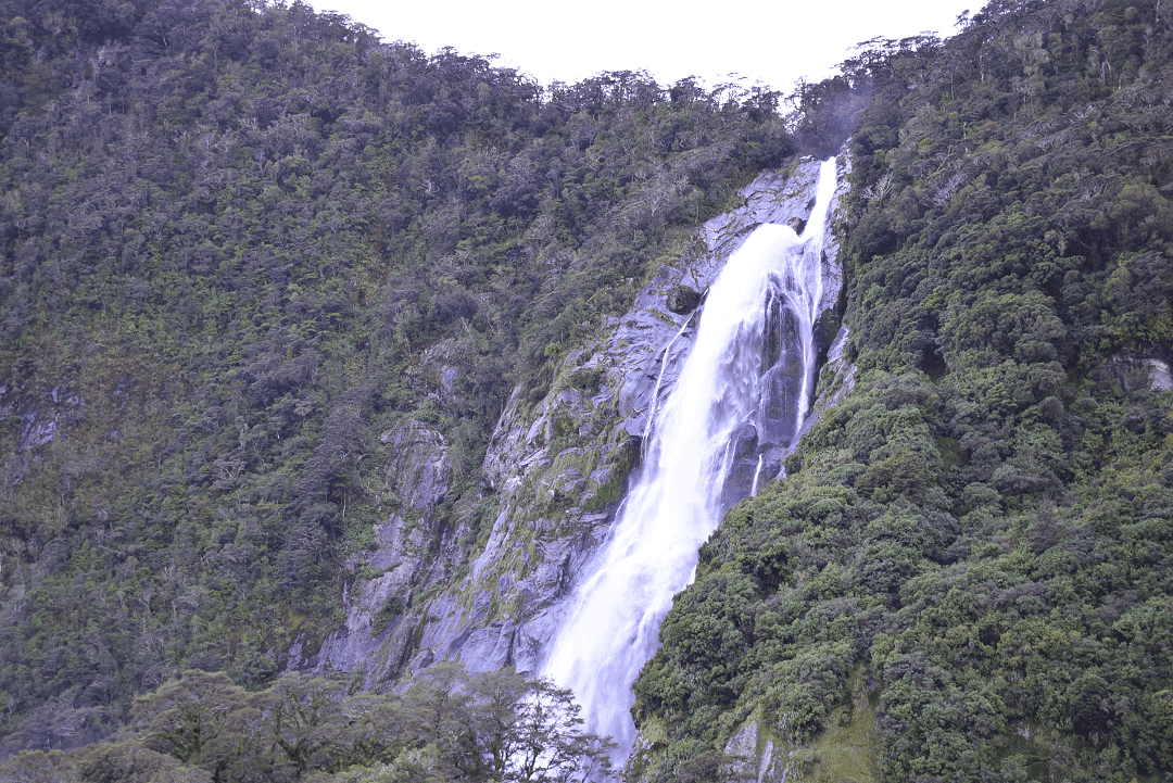 Fairy Falls is a semi-permanent waterfall in Milford Sound. Although not always there, Fairy Falls hangs around for most of the year. This waterfall is a popular place for boat cruises to stop and fill up your glass with some of the purest water in the world!