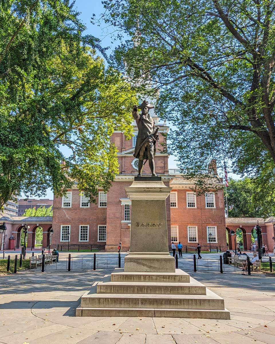 Barry statue sits behind Independence Hall in Philadelphia, USA
