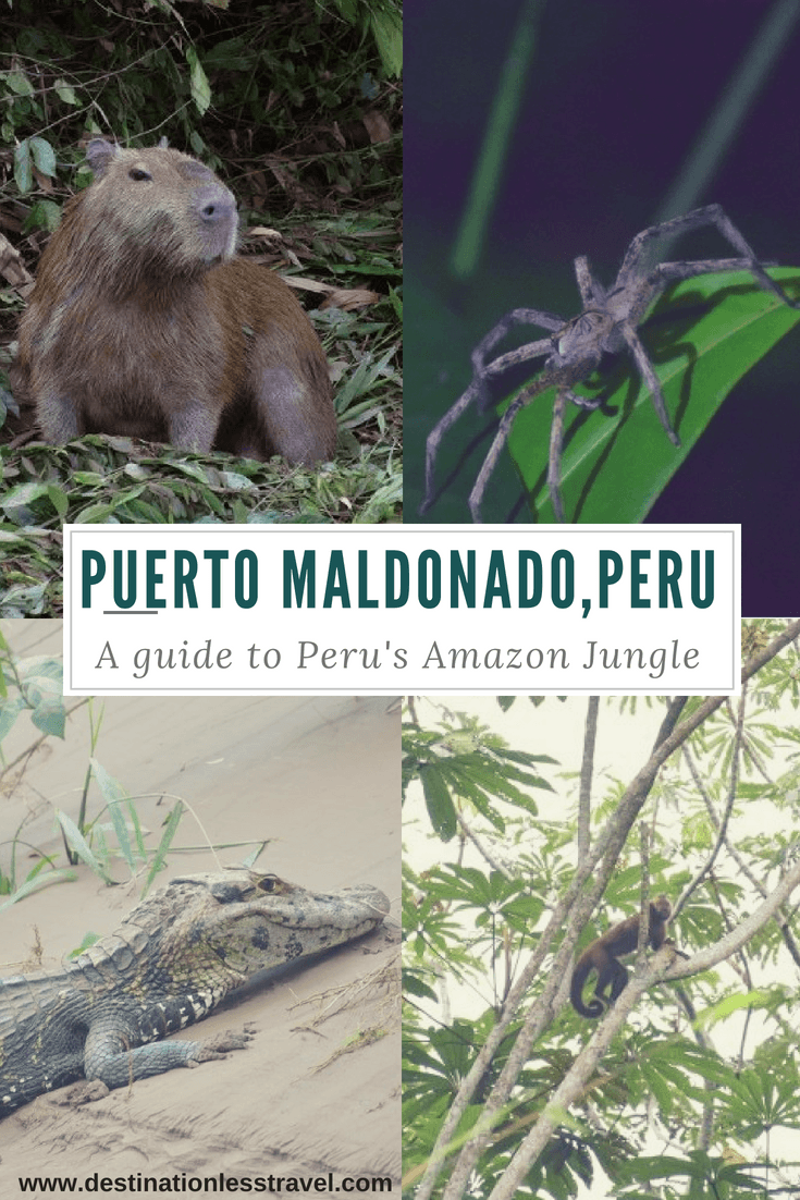 Puerto Maldonado, Peru is a small city within the greater Amazon Rainforest. However, if you want to have a true jungle experience where you see lots of wildlife then you will have to leave Puerto Maldonado city by boat to more remote places.