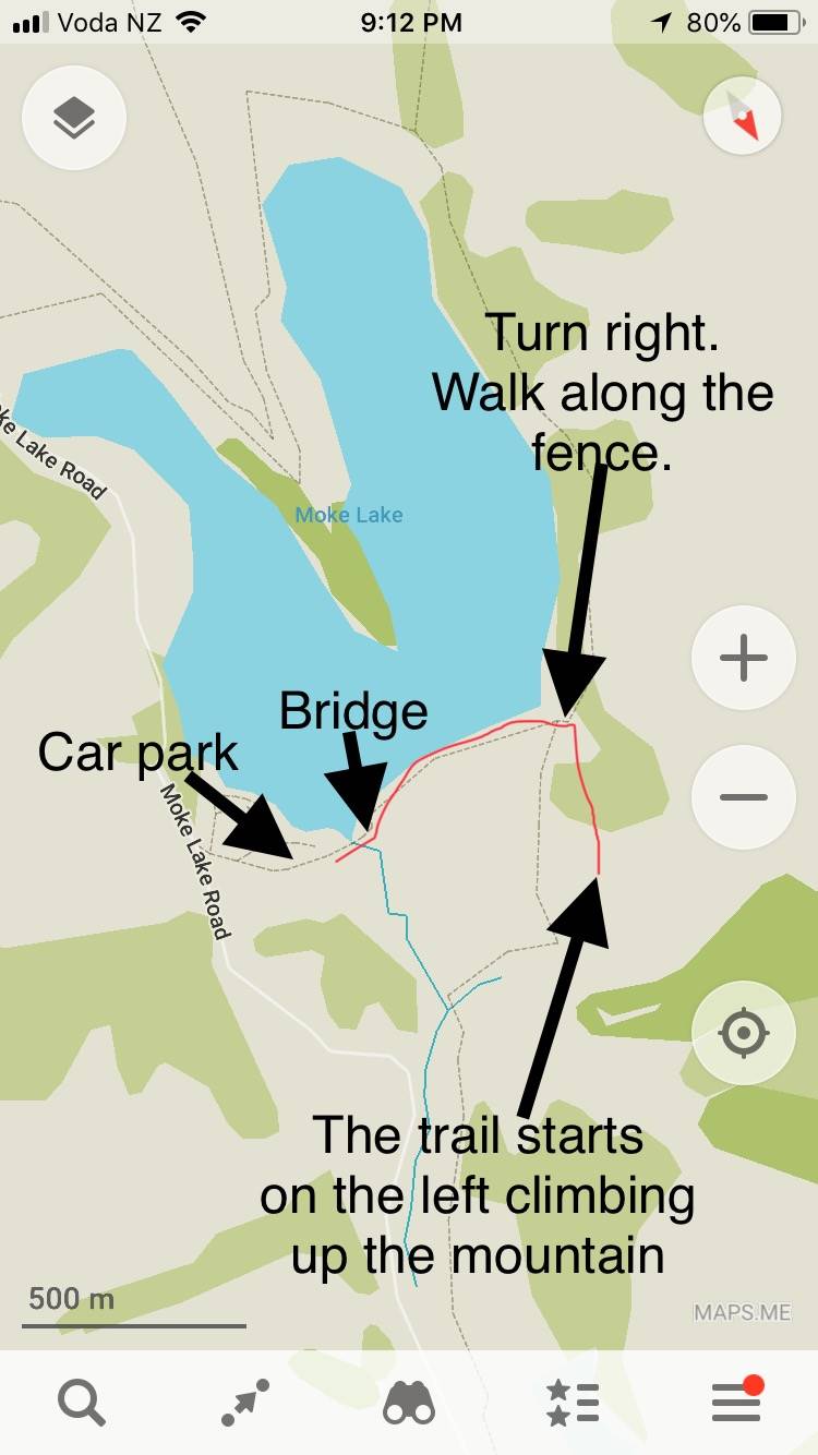 To find the trail you will first need to park in the Moke Lake car parking lot. From the parking lot, you must head along the Moke Lake Loop Track which heads to the right along the edge of the lake and crosses a small bridge.