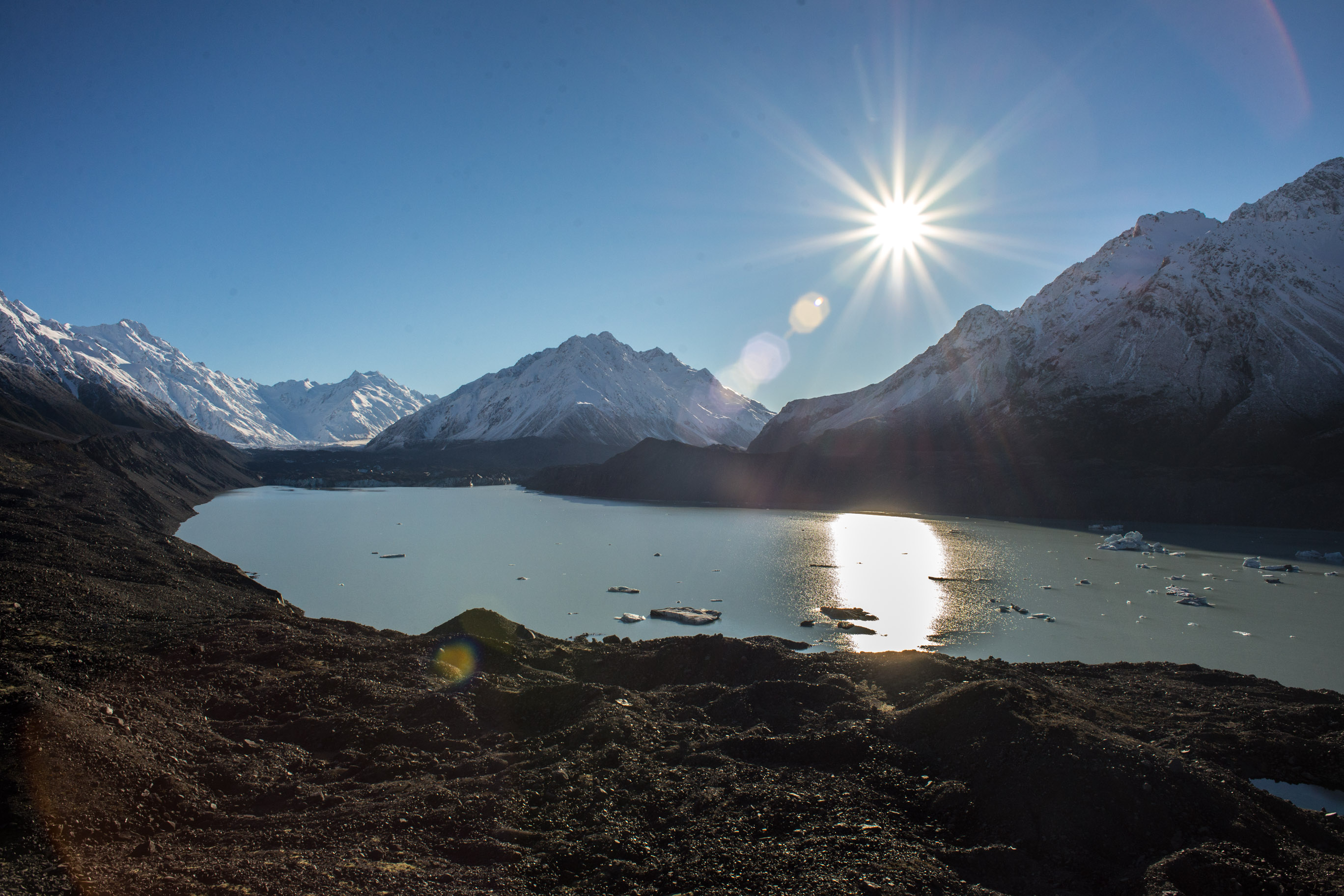 The Tasman Glacier and Tasman Lake just as the sun appears behind the mountains